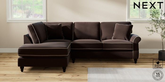 7.3.1 Buy Ashford Relaxed Sit Medium Corner Chaise - Left Hand Fine Chenille with Contrast Chocolate Brown and Oyster Low Turned - Dark from the Next UK online shop Click here to use our accessible website