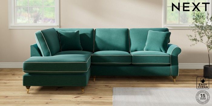 7.3.1 Buy Ashford Relaxed Sit Medium Corner Chaise - Left Hand Fine Chenille with Contrast Dark Juniper Green and Oyster Castor - Mid from the Next UK online shop Click here to use our accessible website