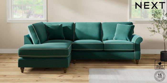 7.3.1 Buy Ashford Relaxed Sit Medium Corner Chaise - Left Hand Fine Chenille with Contrast Dark Juniper Green and Oyster Low Turned - Mid from the Next UK online shop Click here to use our accessible website