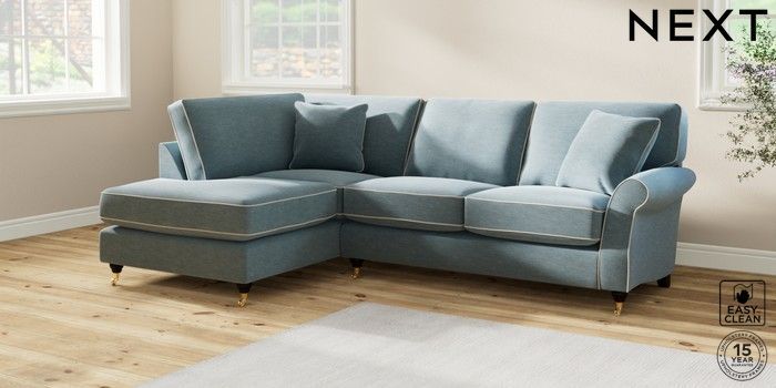 7.3.1 Buy Ashford Relaxed Sit Medium Corner Chaise - Left Hand Fine Chenille with Contrast Mid Blue and Oyster Castor - Dark from the Next UK online shop Click here to use our accessible website