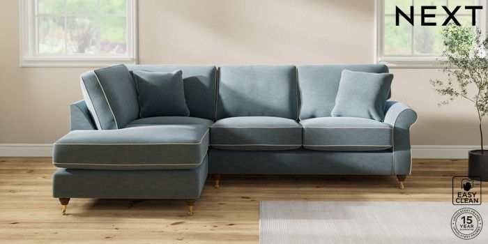 7.3.1 Buy Ashford Relaxed Sit Medium Corner Chaise - Left Hand Fine Chenille with Contrast Mid Blue and Oyster Castor - Mid from the Next UK online shop Click here to use our accessible website