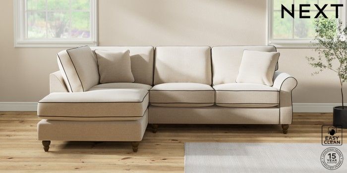7.3.1 Buy Ashford Relaxed Sit Medium Corner Chaise - Left Hand Fine Chenille with Contrast Oyster and Black Low Turned - Mid from the Next UK online shop Click here to use our accessible website