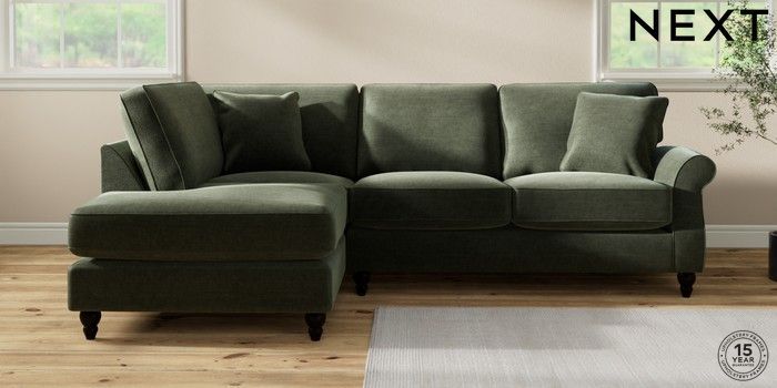 6.12.1 Buy Ashford Relaxed Sit Medium Corner Chaise - Left Hand Luxe Chenille Mid Green Low Turned - Dark from the Next UK online shop Click here to use our accessible website