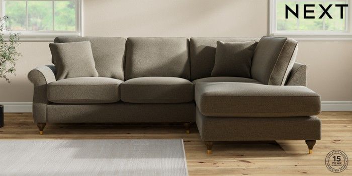 6.12.1 Buy Ashford Relaxed Sit Medium Corner Chaise - Right Hand Chunky Marl Light Olive Green Modern Turned Metal Cap - Mid from the Next UK online shop Click here to use our accessible website