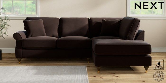 6.12.1 Buy Ashford Relaxed Sit Medium Corner Chaise - Right Hand Fine Chenille Easy Clean Chocolate Brown Modern Turned Metal Cap - Mid from the Next UK online shop Click here to use our accessible website