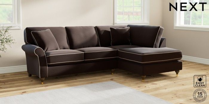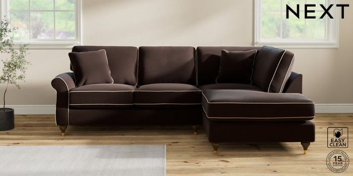 7.3.1 Buy Ashford Relaxed Sit Medium Corner Chaise - Right Hand Fine Chenille with Contrast Chocolate Brown and Oyster Modern Turned Metal Cap - Mid from the Next UK online shop Click here to use our accessible website