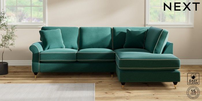 7.3.1 Buy Ashford Relaxed Sit Medium Corner Chaise - Right Hand Fine Chenille with Contrast Dark Juniper Green and Oyster Castor - Dark from the Next UK online shop Click here to use our accessible website