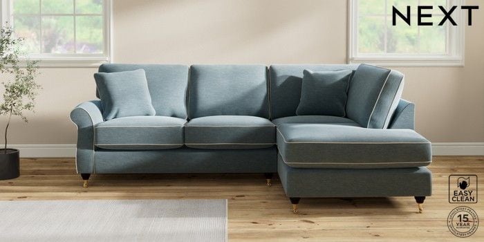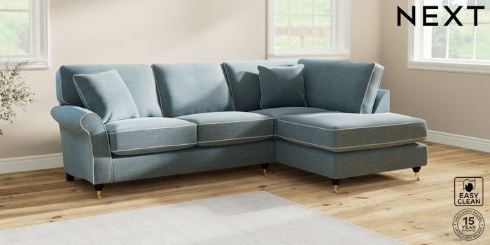 7.3.1 Buy Ashford Relaxed Sit Medium Corner Chaise - Right Hand Fine Chenille with Contrast Mid Blue and Oyster Castor - Dark from the Next UK online shop Click here to use our accessible website