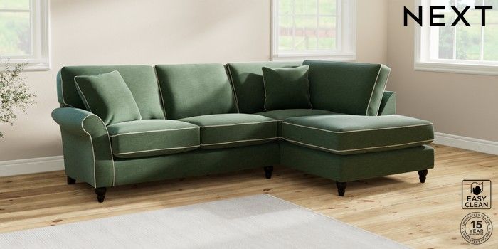 7.3.1 Buy Ashford Relaxed Sit Medium Corner Chaise - Right Hand Fine Chenille with Contrast Mid Khaki Green and Oyster Low Turned - Dark from the Next UK online shop Click here to use our accessible website