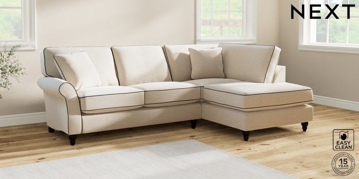 7.3.1 Buy Ashford Relaxed Sit Medium Corner Chaise - Right Hand Fine Chenille with Contrast Oyster and Black Low Turned - Dark from the Next UK online shop Click here to use our accessible website