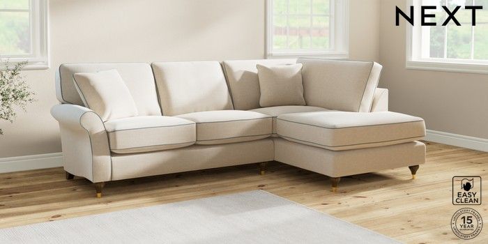 7.3.1 Buy Ashford Relaxed Sit Medium Corner Chaise - Right Hand Fine Chenille with Contrast Oyster and Mid Blue Modern Turned Metal Cap - Mid from the Next UK online shop Click here to use our accessible website