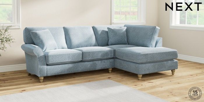 7.2.6 Buy Ashford Relaxed Sit Medium Corner Chaise - Right Hand Plush Chenille Light Blue Low Turned - Light from the Next UK online shop Click here to use our accessible website