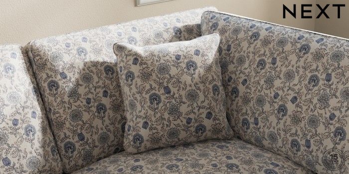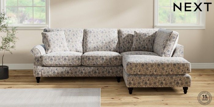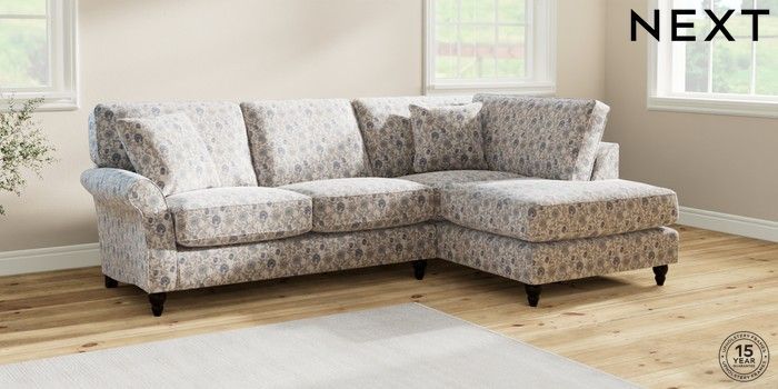 7.3.1 Buy Ashford Relaxed Sit Medium Corner Chaise - Right Hand Relaxed Linen Look Print Woodblock Floral Blue Low Turned - Dark from the Next UK online shop Click here to use our accessible website