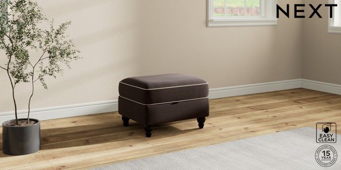 7.3.1 Buy Ashford Relaxed Sit Storage Footstool Fine Chenille with Contrast Chocolate Brown and Oyster Low Turned - Dark from the Next UK online shop Click here to use our accessible website