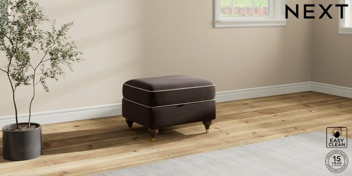 7.3.1 Buy Ashford Relaxed Sit Storage Footstool Fine Chenille with Contrast Chocolate Brown and Oyster Modern Turned Metal Cap - Mid from the Next UK online shop Click here to use our accessible website