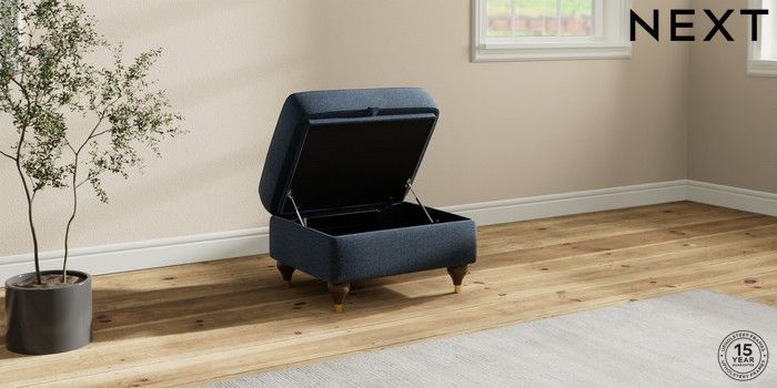 6.12.1 Buy Ashford Relaxed Sit Storage Footstool Ripple Chenille Dark Blue Modern Turned Metal Cap - Mid from the Next UK online shop Click here to use our accessible website