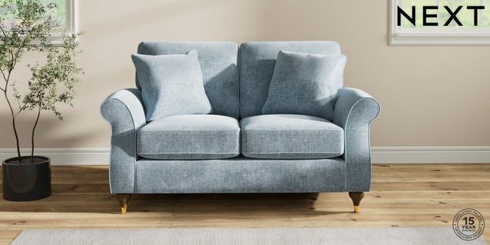 7.2.6 Buy Ashford 2 Seater Small Sofa Plush Chenille Light Blue Modern Turned Metal Cap - Mid from the Next UK online shop Click here to use our accessible website