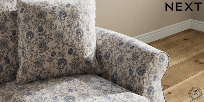 7.3.1 Buy Ashford 2 Seater Small Sofa Relaxed Linen Look Print Woodblock Floral Blue Modern Turned Metal Cap - Mid from the Next UK online shop Click here to use our accessible website