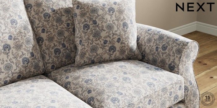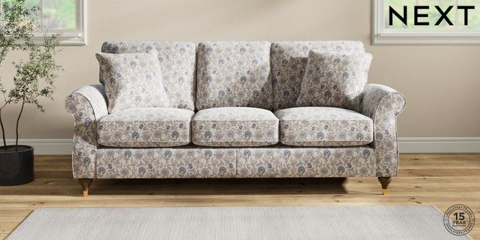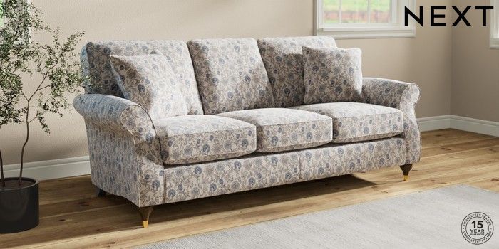 7.3.1 Buy Ashford 3 Cushion 3 Seater Sofa Relaxed Linen Look Print Woodblock Floral Blue Modern Turned Metal Cap - Mid from the Next UK online shop
