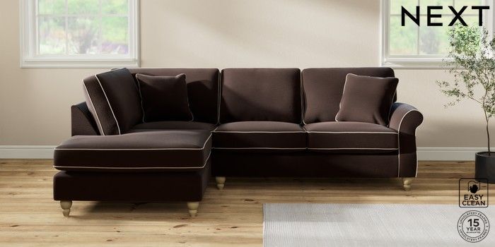 7.3.1 Buy Ashford Medium Corner Chaise - Left Hand Fine Chenille with Contrast Chocolate Brown and Oyster Low Turned - Light from the Next UK online shop Click here to use our accessible website