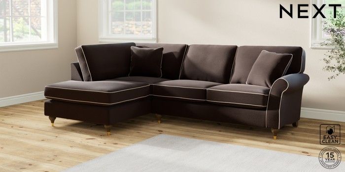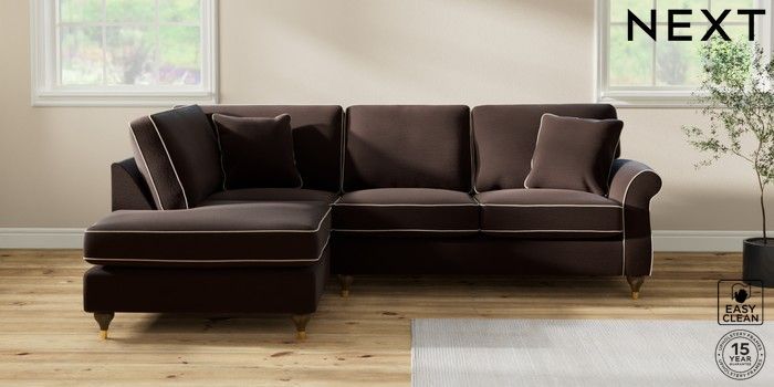 7.3.1 Buy Ashford Medium Corner Chaise - Left Hand Fine Chenille with Contrast Chocolate Brown and Oyster Modern Turned Metal Cap - Mid from the Next UK online shop Click here to use our accessible website