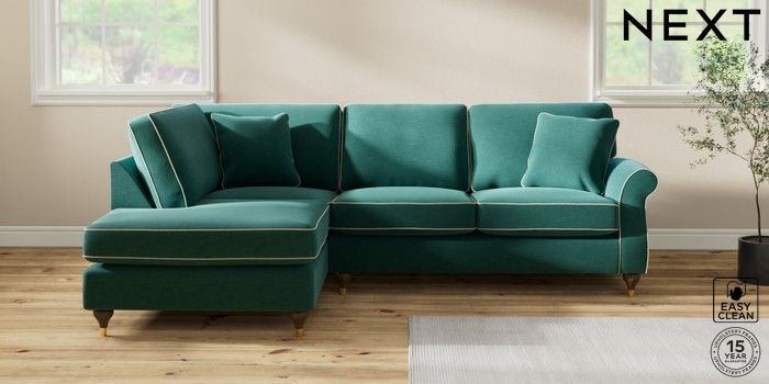 7.3.1 Buy Ashford Medium Corner Chaise - Left Hand Fine Chenille with Contrast Dark Juniper Green and Oyster Modern Turned Metal Cap - Mid from the Next UK online shop Click here to use our accessible website