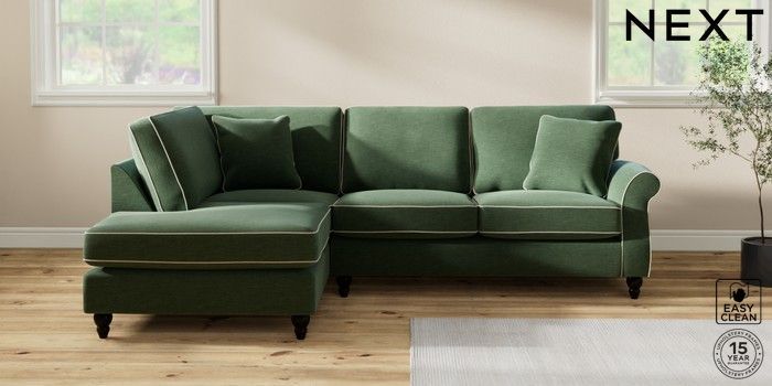 7.3.1 Buy Ashford Medium Corner Chaise - Left Hand Fine Chenille with Contrast Mid Khaki Green and Oyster Low Turned - Dark from the Next UK online shop Click here to use our accessible website