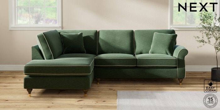 7.3.1 Buy Ashford Medium Corner Chaise - Left Hand Fine Chenille with Contrast Mid Khaki Green and Oyster Modern Turned Metal Cap - Mid from the Next UK online shop Click here to use our accessible website