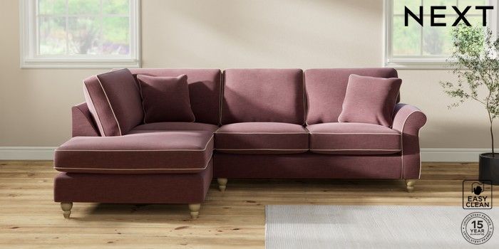 7.3.1 Buy Ashford Medium Corner Chaise - Left Hand Fine Chenille with Contrast Mid Mulberry Purple and Oyster Low Turned - Light from the Next UK online shop Click here to use our accessible website