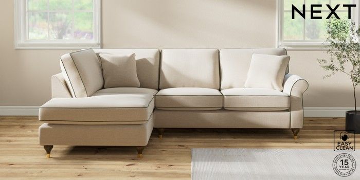 7.3.1 Buy Ashford Medium Corner Chaise - Left Hand Fine Chenille with Contrast Oyster and Mid Khaki Green Modern Turned Metal Cap - Mid from the Next UK online shop Click here to use our accessible website