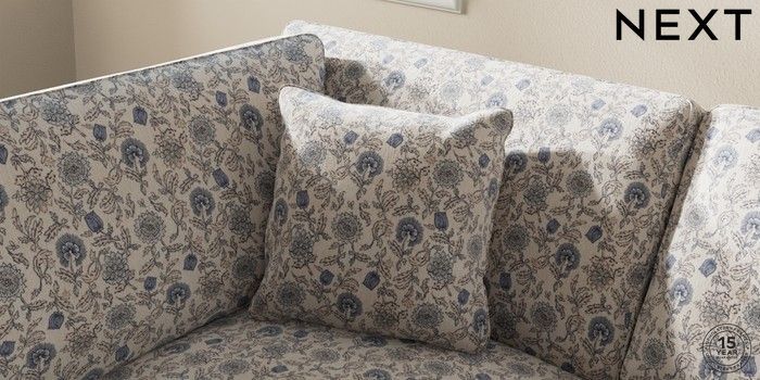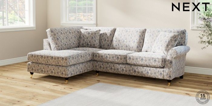 7.3.1 Buy Ashford Medium Corner Chaise - Left Hand Relaxed Linen Look Print Woodblock Floral Blue Castor - Dark from the Next UK online shop Click here to use our accessible website