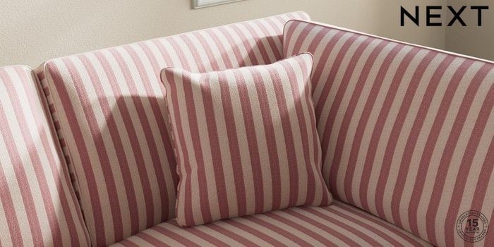 7.3.1 Buy Ashford Medium Corner Chaise - Right Hand Bold Chenille Stripe Dark Pink Modern Turned Metal Cap - Mid from the Next UK online shop