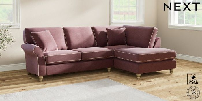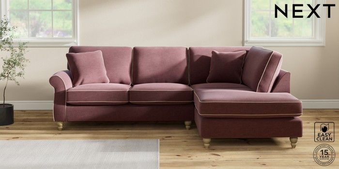 7.3.1 Buy Ashford Medium Corner Chaise - Right Hand Fine Chenille with Contrast Mid Mulberry Purple and Oyster Low Turned - Light from the Next UK online shop Click here to use our accessible website