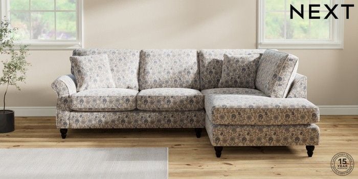7.3.1 Buy Ashford Medium Corner Chaise - Right Hand Relaxed Linen Look Print Woodblock Floral Blue Low Turned - Dark from the Next UK online shop Click here to use our accessible website