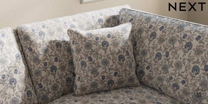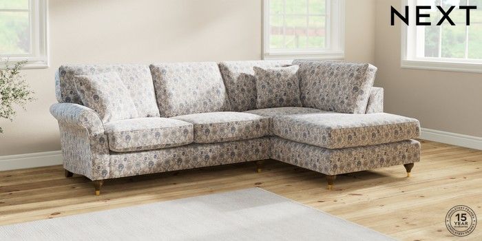 7.3.1 Buy Ashford Medium Corner Chaise - Right Hand Relaxed Linen Look Print Woodblock Floral Blue Modern Turned Metal Cap - Mid from the Next UK online shop Click here to use our accessible website