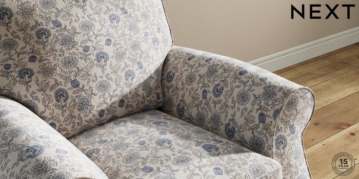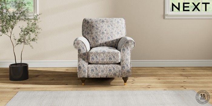7.3.1 Buy Ashford Small Armchair Relaxed Linen Look Print Woodblock Floral Blue Modern Turned Metal Cap - Mid from the Next UK online shop