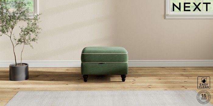 7.3.1 Buy Ashford Storage Footstool Fine Chenille with Contrast Mid Khaki Green and Oyster Low Turned - Dark from the Next UK online shop Click here to use our accessible website