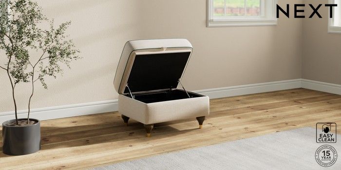 7.3.1 Buy Ashford Storage Footstool Fine Chenille with Contrast Oyster and Dark Juniper Green Modern Turned Metal Cap - Mid from the Next UK online shop Click here to use our accessible website