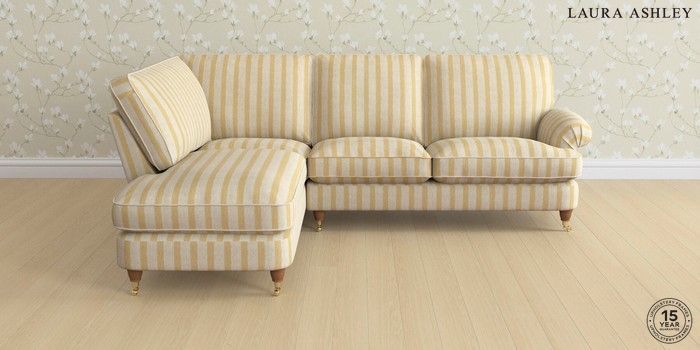 7.0.3 Buy Beaumaris by Laura Ashley Medium Sofa Chaise - Left Hand Kinsham Stripe Ochre Yellow Low Brass Castor - Teak from the Next UK online shop Click here to use our accessible website