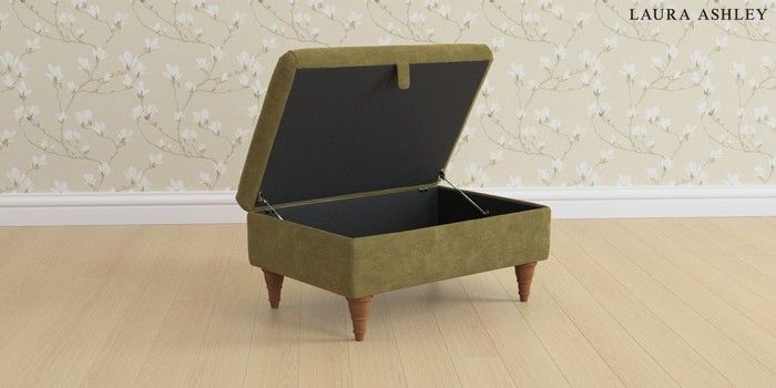 6.12.1 Buy Beaumaris by Laura Ashley Storage Footstool Alwyn Velvet Olive Green Low Turned - Teak from the Next UK online shop Click here to use our accessible website