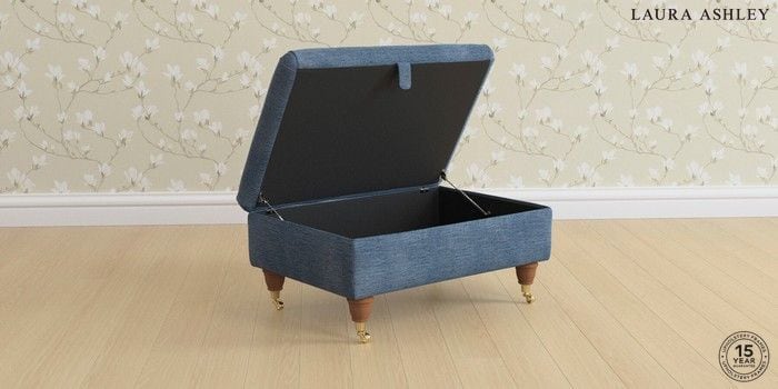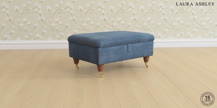 6.12.1 Buy Beaumaris by Laura Ashley Storage Footstool Edwin Chenille Seaspray Blue Low Brass Castor - Teak from the Next UK online shop Click here to use our accessible website