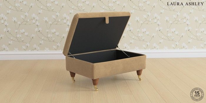 6.12.1 Buy Beaumaris by Laura Ashley Storage Footstool Lundar Chenille Caramel Natural Low Brass Castor - Teak from the Next UK online shop Click here to use our accessible website