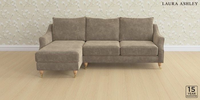 6.12.13 Buy Beverley by Laura Ashley Medium Sofa Chaise - Left Hand Alwyn Velvet Truffle Natural Low Brass Castor - Light Oak from the Next UK online shop Click here to use our accessible website