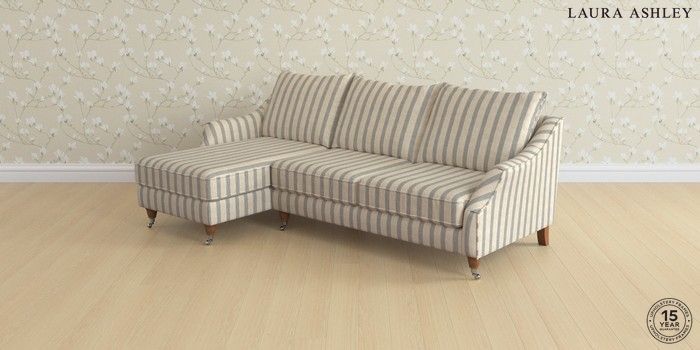 7.2.6 Buy Beverley by Laura Ashley Medium Sofa Chaise - Left Hand Kinsham Stripe Seaspray Blue Low Chrome Castor - Teak from the Next UK online shop Click here to use our accessible website