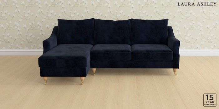 6.12.1 Buy Beverley by Laura Ashley Medium Sofa Chaise - Left Hand Orla Midnight Navy Low Brass Castor - Light Oak from the Next UK online shop Click here to use our accessible website