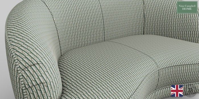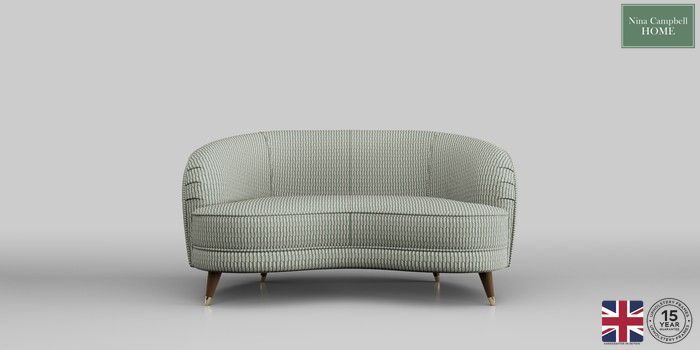 Bramerton by Nina Campbell is an elegant curved shaped sofa, perfect for interior enthusiasts. Designed with a serpentine sprung seat and superloop sprung back to provide excellent support and longevity, the multi layered foam fixed seat and back construction wraps for supreme comfort. With a matching footstool that seamlessly nestles into the curve of the sofa to create a chaise when desired. The tapered show wood legs with brass slipper cups add detail and sophistication for the finishing touches. Requires minimal assembly for feet.