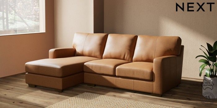 6.12.1 Buy Brooklyn Leather Small Sofa Chaise - Left Hand Antiqued Leather Light Tan Brown Slim Block - Mid from the Next UK online shop Click here to use our accessible website