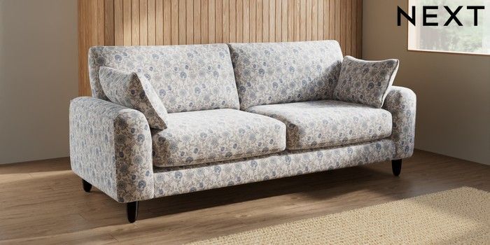 7.3.1 Buy Campbell 3 Seater Sofa Relaxed Linen Look Print Woodblock Floral Blue High Leg - Dark from the Next UK online shop Click here to use our accessible website