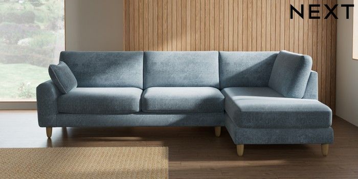 7.2.10 Buy Campbell Large Corner Chaise - Right Hand Plush Chenille Light Blue High Leg - Light from the Next UK online shop Click here to use our accessible website