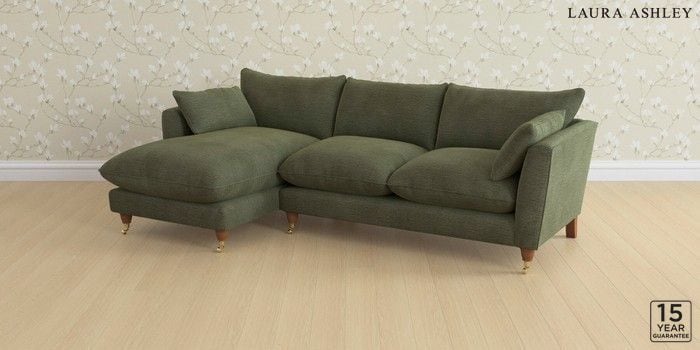 6.12.1 Buy Casterton by Laura Ashley Medium Sofa Chaise - Left Hand Edwin Chenille Hedgerow Green Low Brass Castor - Teak from the Next UK online shop Click here to use our accessible website